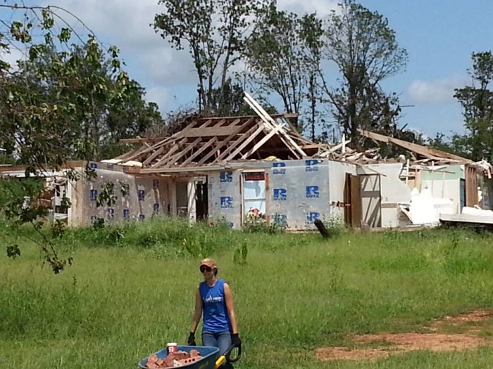 Tammy carries bricks to the road for pickup.
